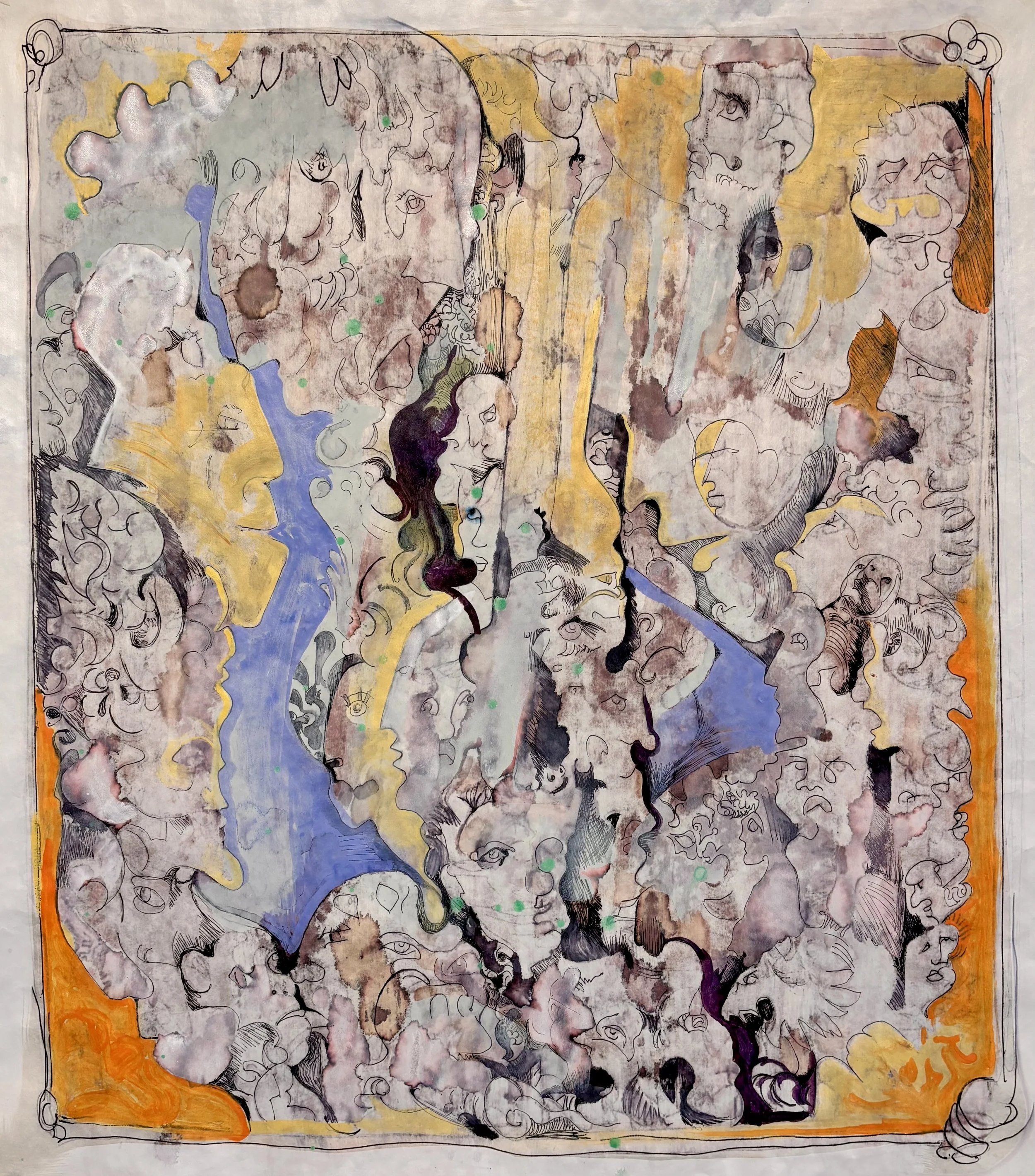 Abstract artwork featuring numerous overlapping human faces and profiles, with a mix of watercolor and ink, accented by splashes of green, orange, blue, and yellow.
