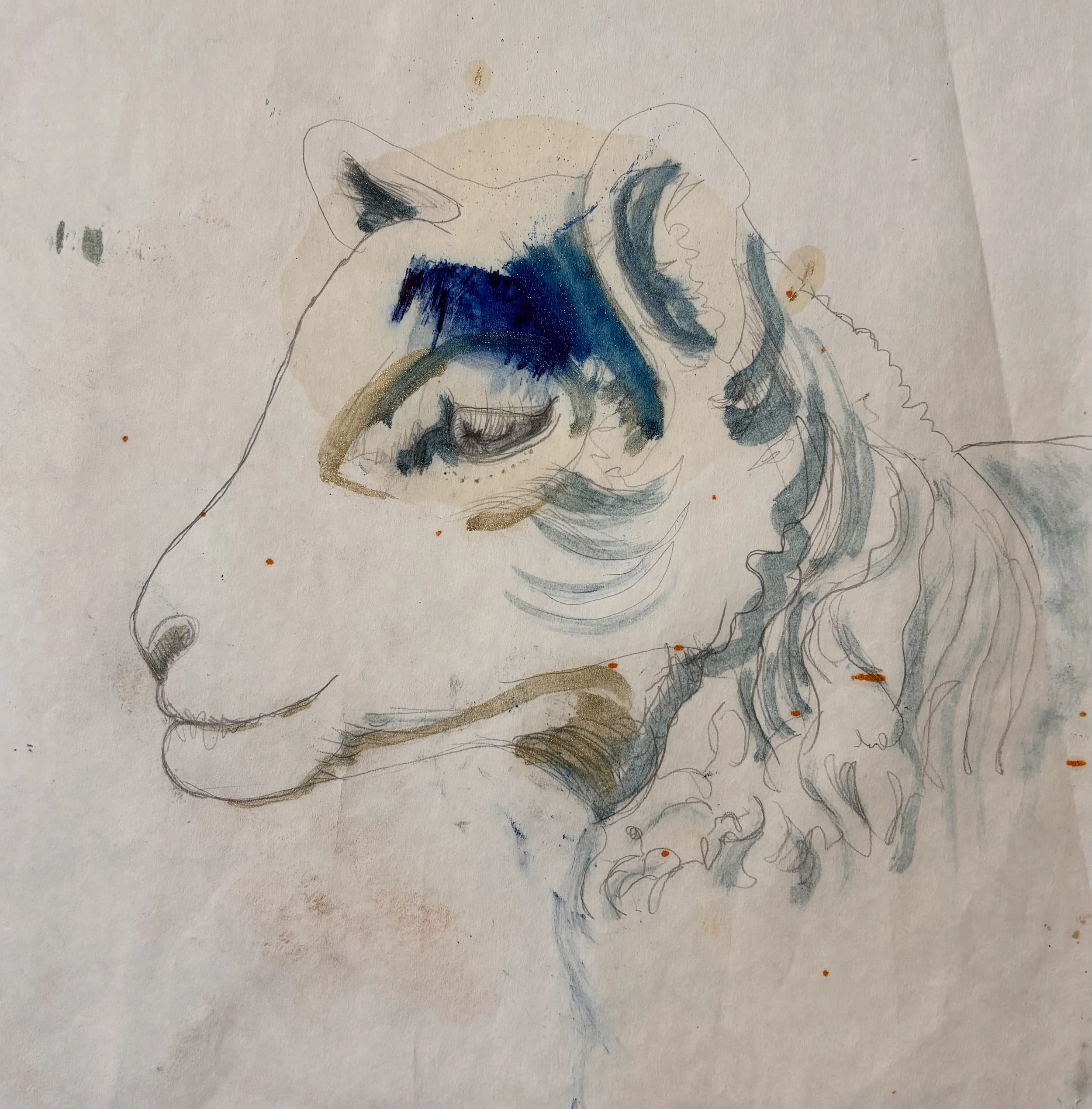 A watercolor sketch of a lion's profile on paper, featuring detailed lines and splashes of blue, black, and beige for the mane and facial features.