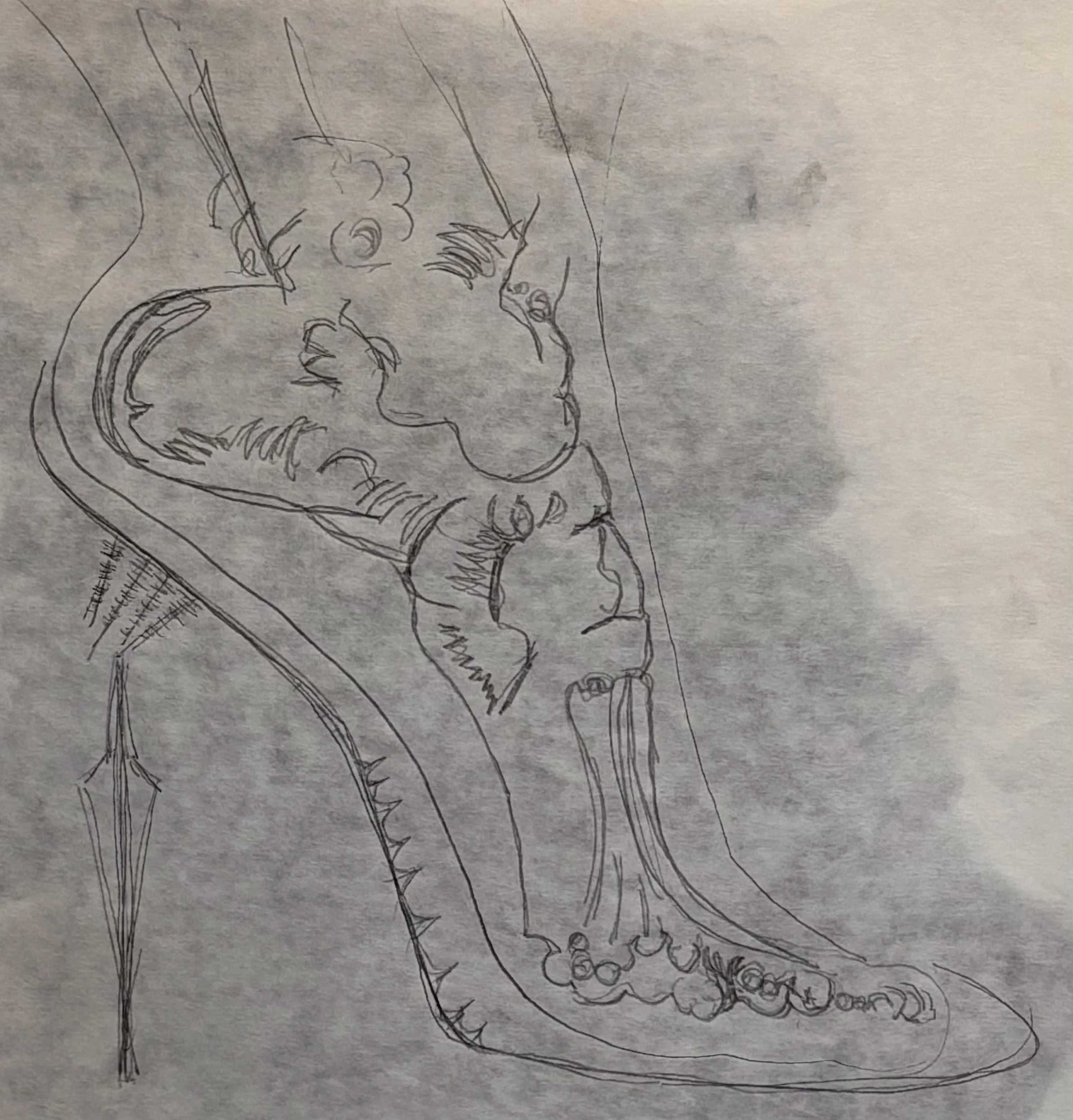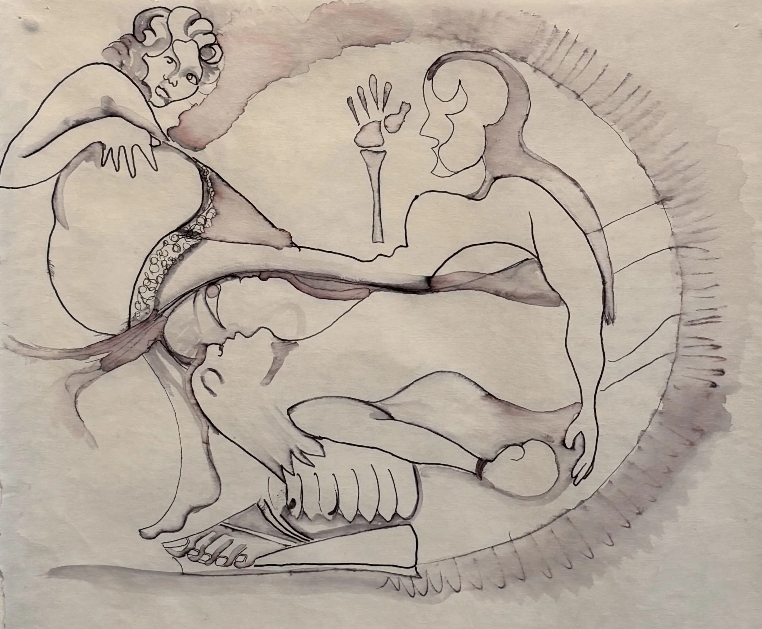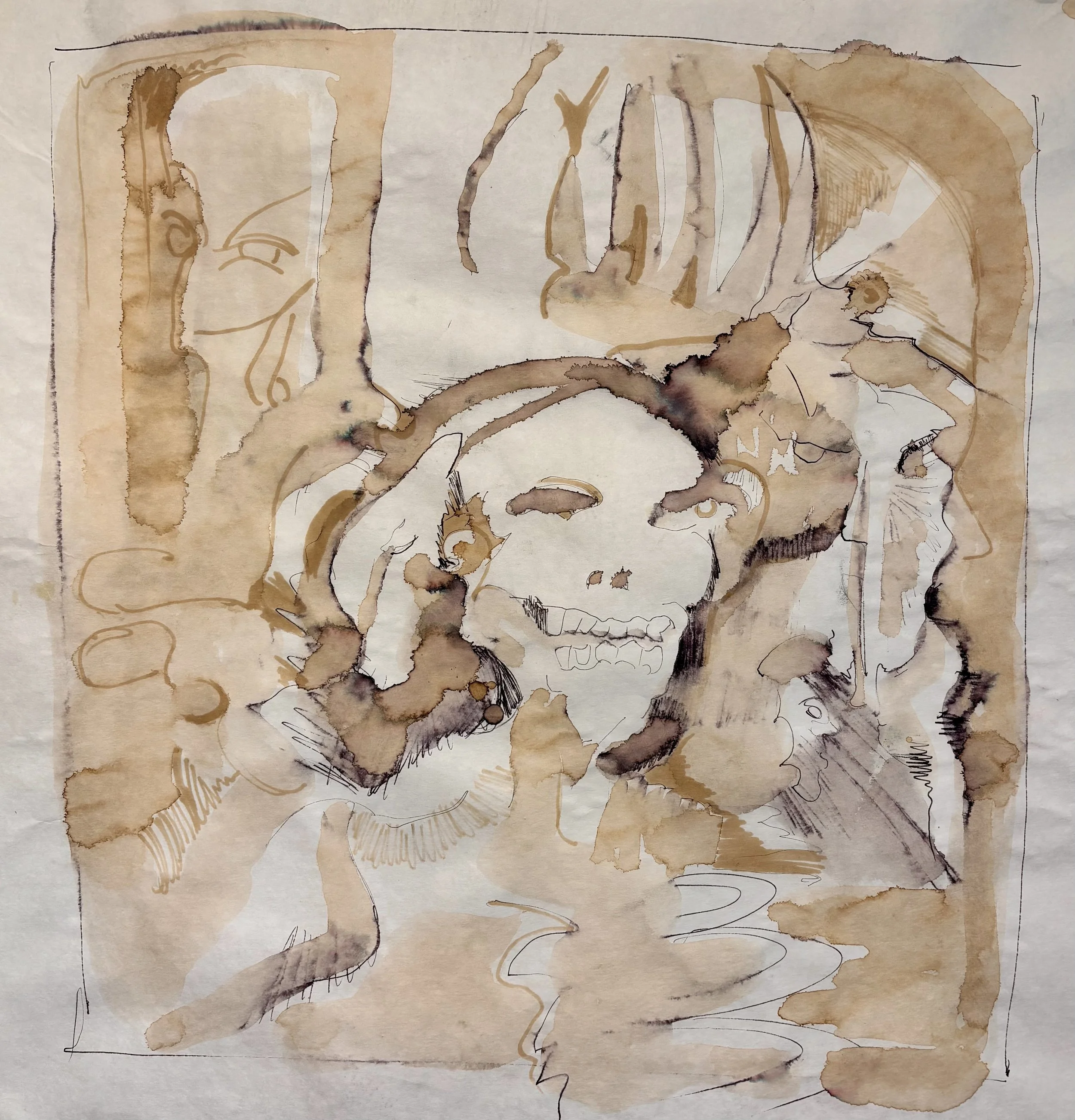 Sketch of a smiling woman with wavy hair, surrounded by abstract lines and shapes, painted with sepia-toned watercolor washes.