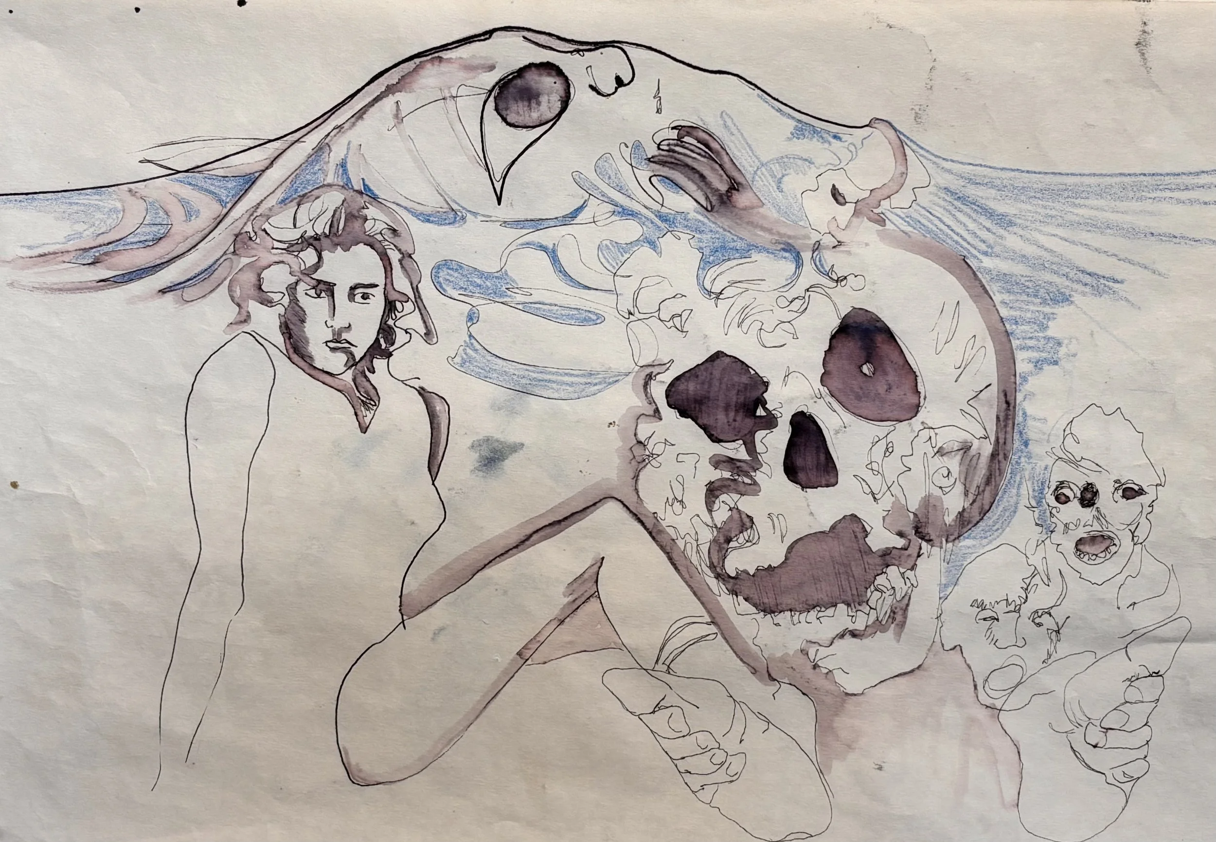 A mixed media drawing featuring a woman with wavy hair, a large skull with dark eye sockets, a smaller detailed face, and a small child with dark eyes and a surprised expression. The artwork combines line art with watercolor shading.