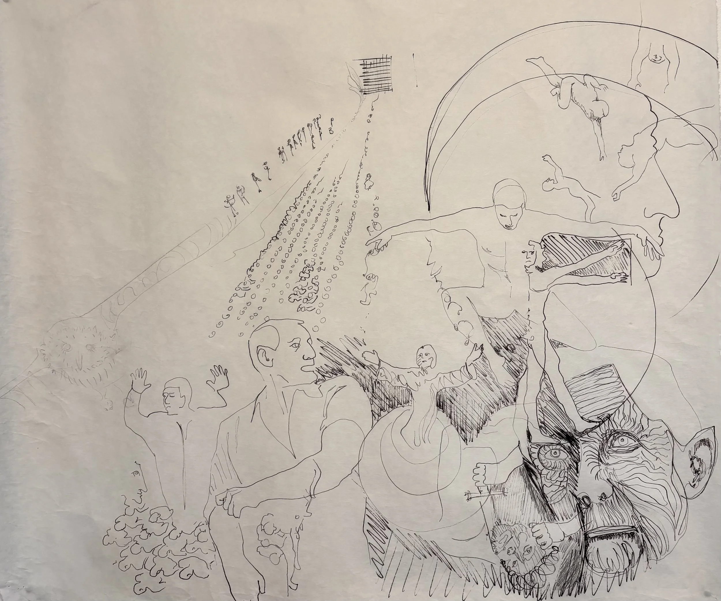 A detailed line drawing featuring various human figures, animals, and abstract shapes, with a large, complex head at the center. The figures appear to be interconnected, with some reaching out or gesturing, and others embedded within larger shapes.