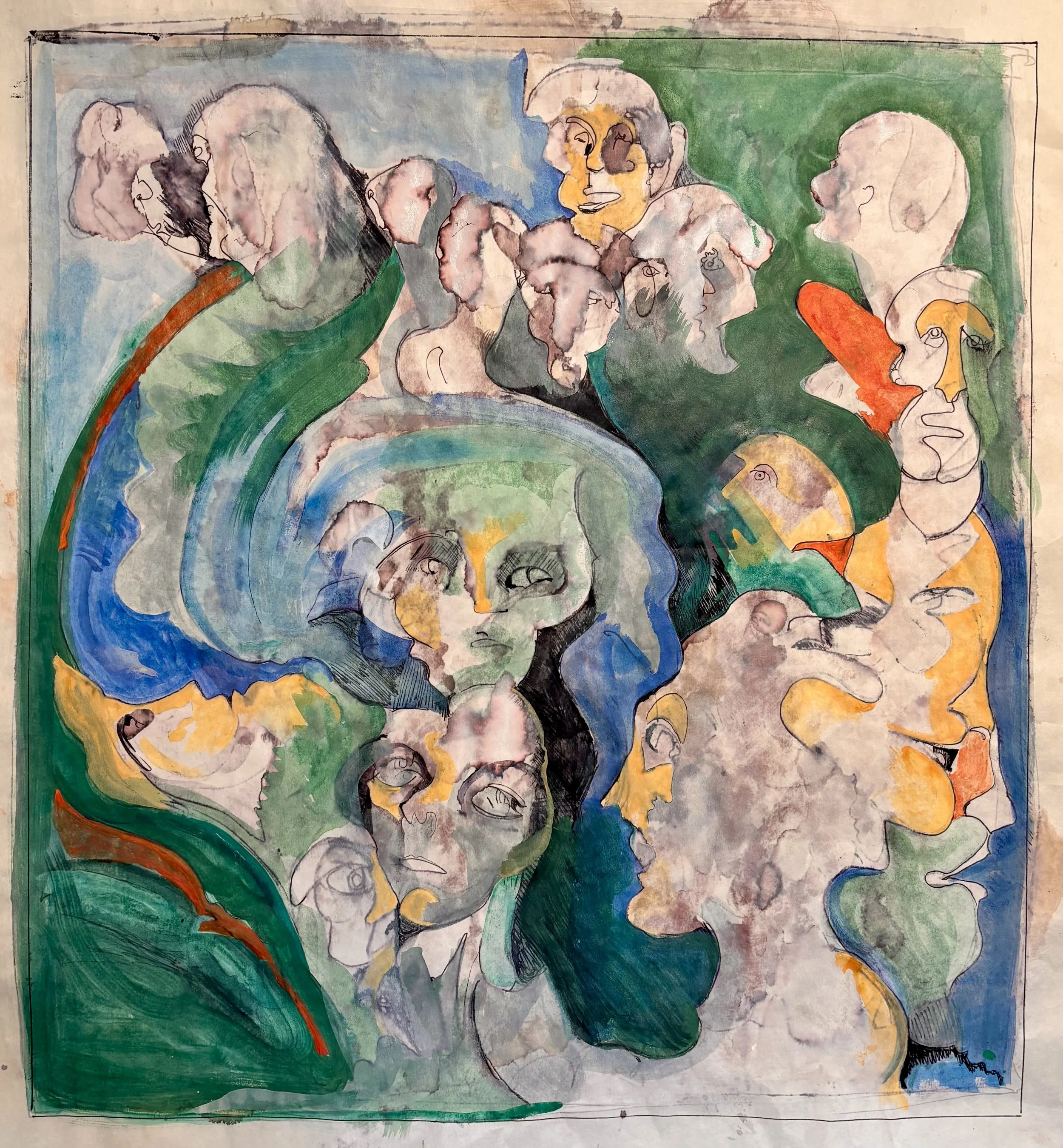 Abstract watercolor artwork featuring multiple overlapping human faces and figures in various colors, including green, blue, orange, yellow, and pink, with expressive lines and blurred features.