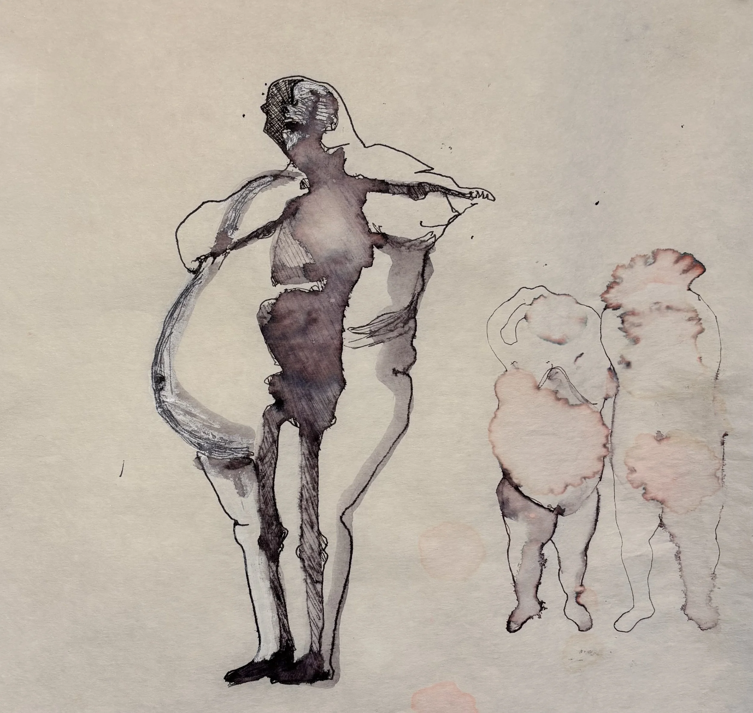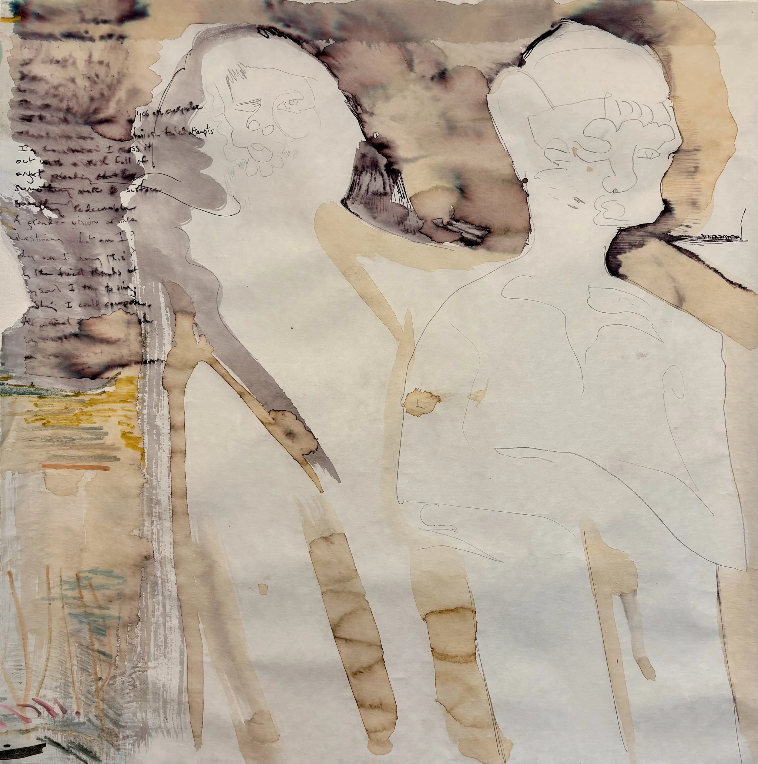 A mixed media artwork featuring two abstractly sketched human figures, with watercolor washes and handwritten text elements.