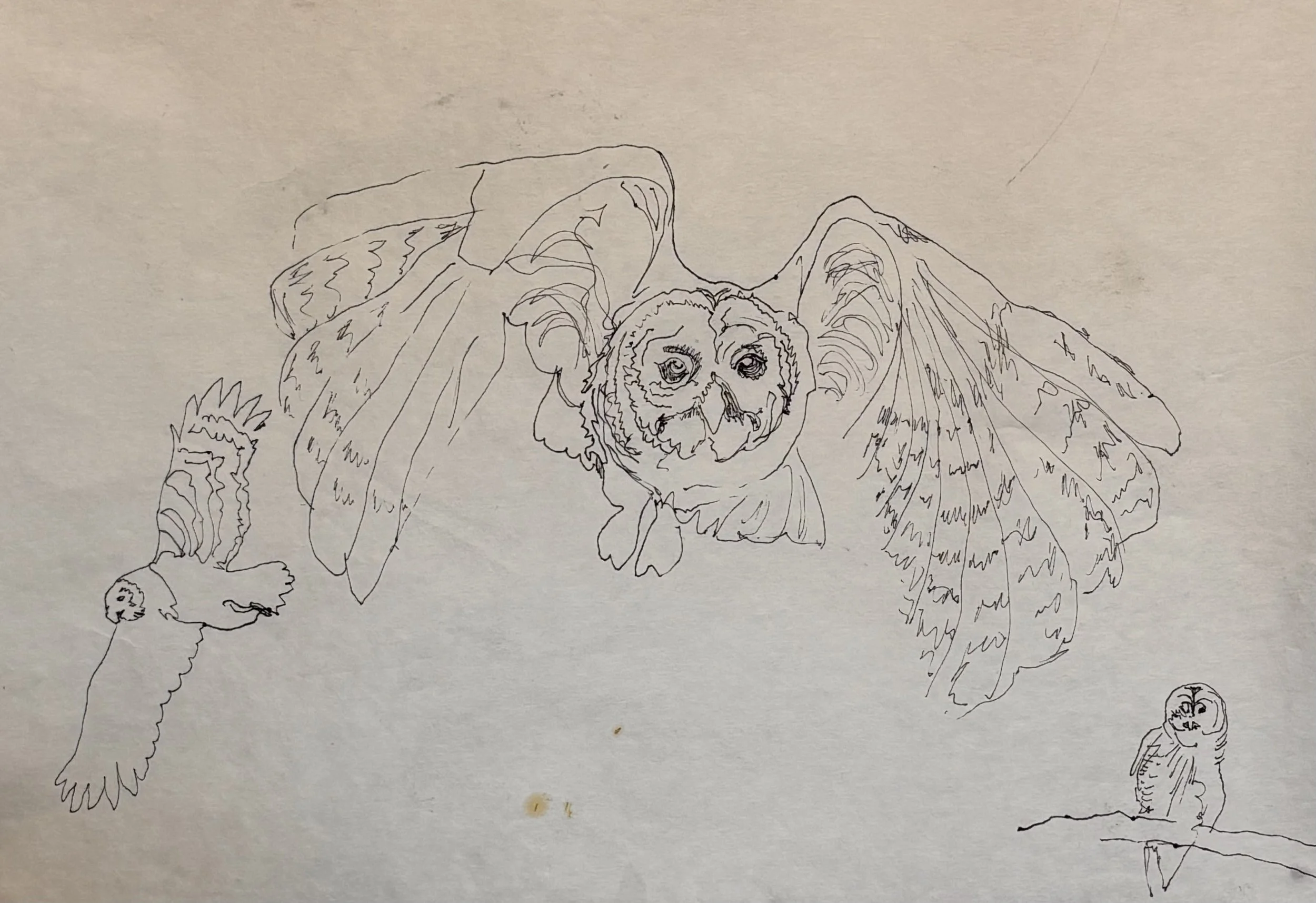 Line drawing of a flying owl with large wings, a detailed face, and two smaller owls below it. One smaller owl appears to be perched on a branch.