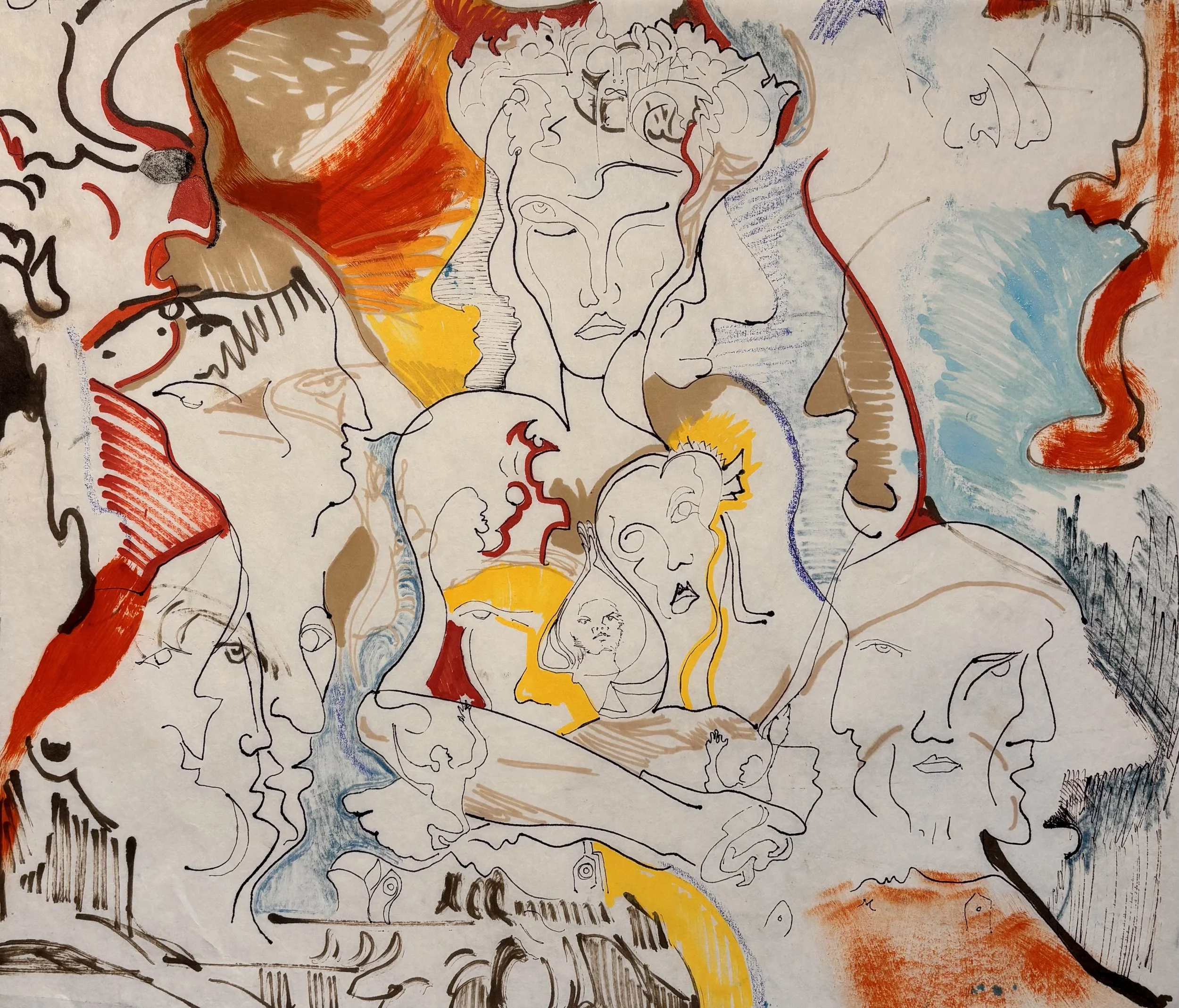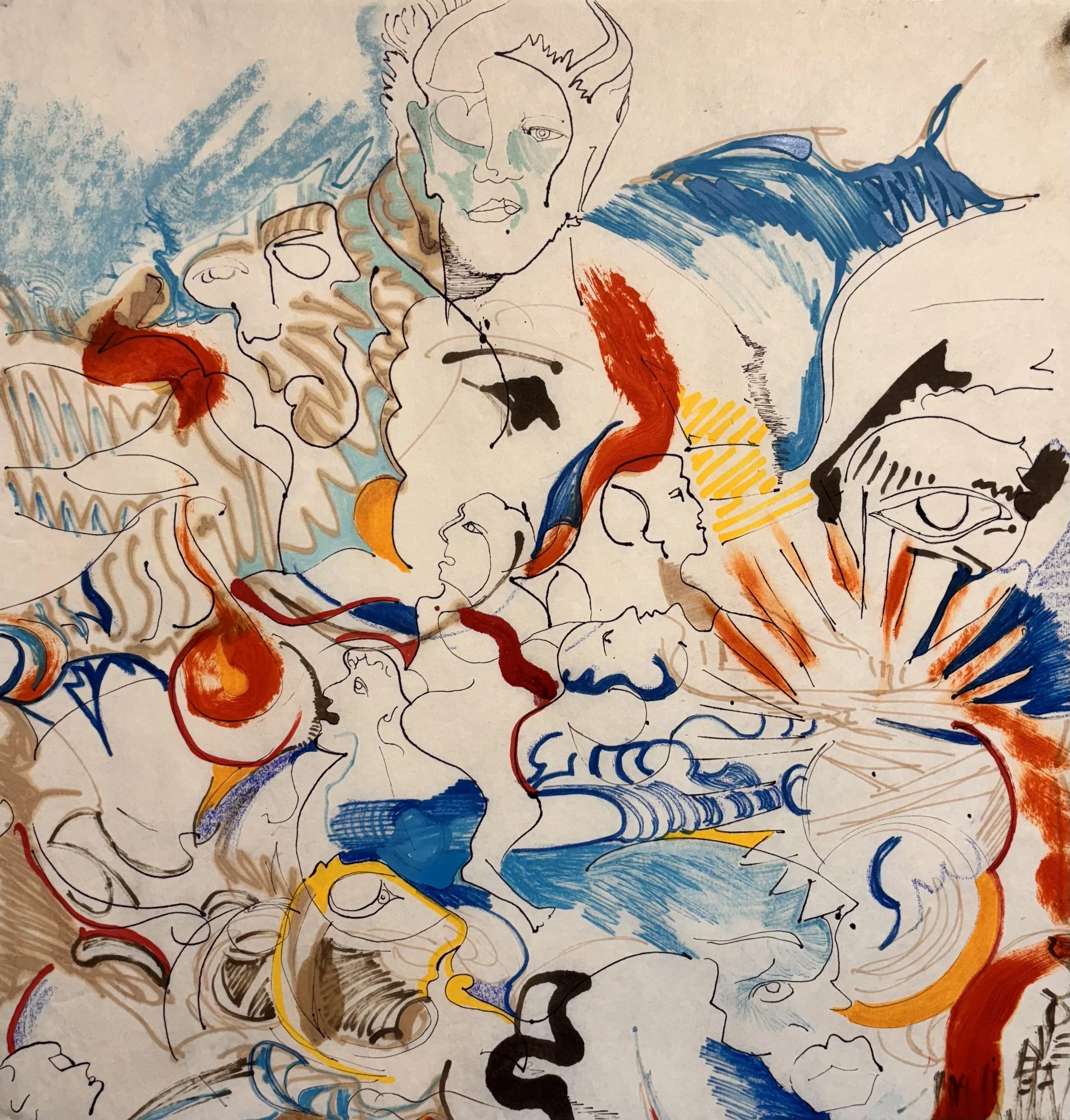 Abstract line drawing featuring various faces, eyes, and figures with splashes of blue, red, yellow, black, and beige colors, arranged in a chaotic, artistic composition.