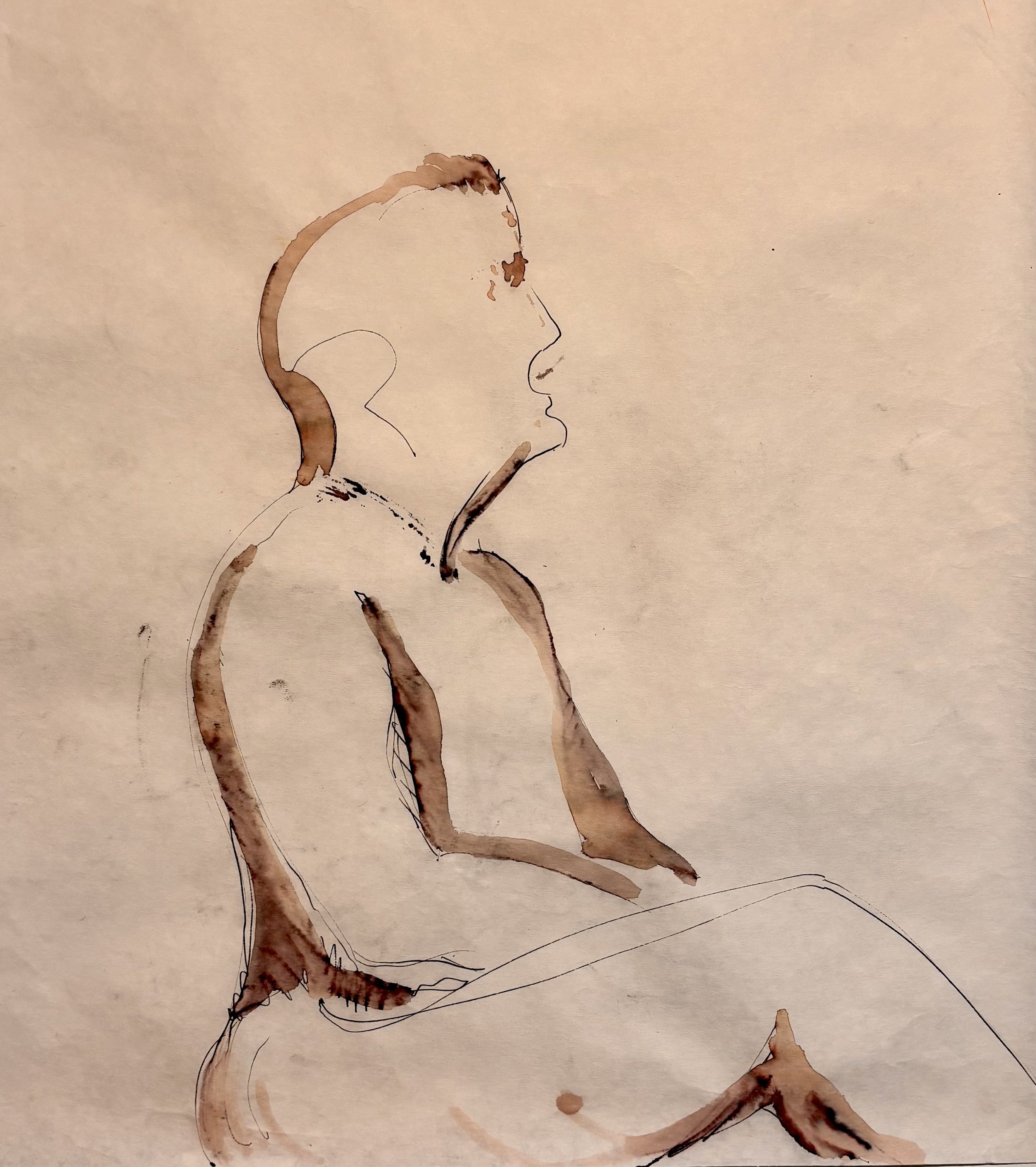 Line drawing of a seated woman with brown watercolor accents on her outline.