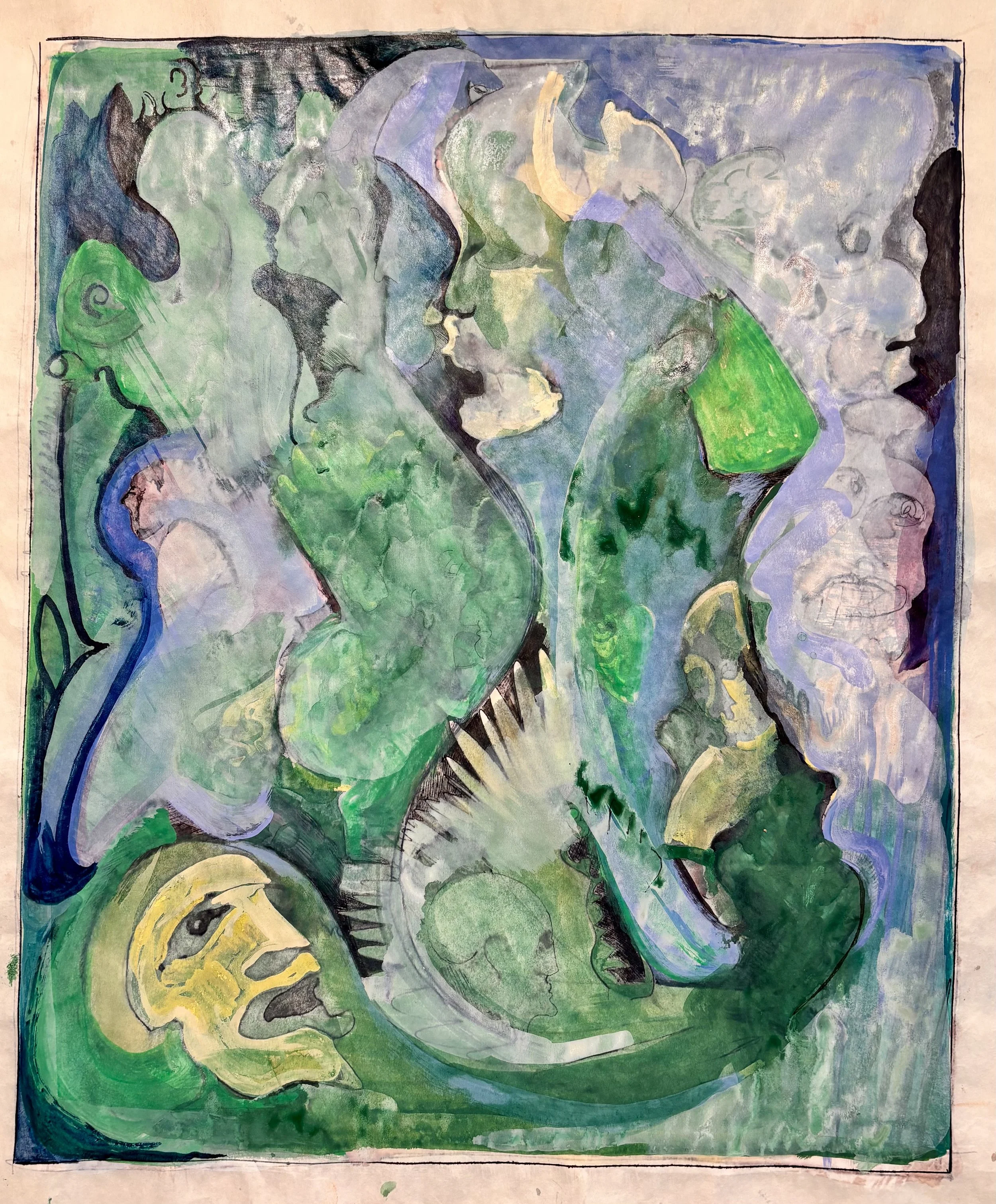 An abstract watercolor painting featuring multiple overlapping faces and figures in shades of green, blue, yellow, and black.
