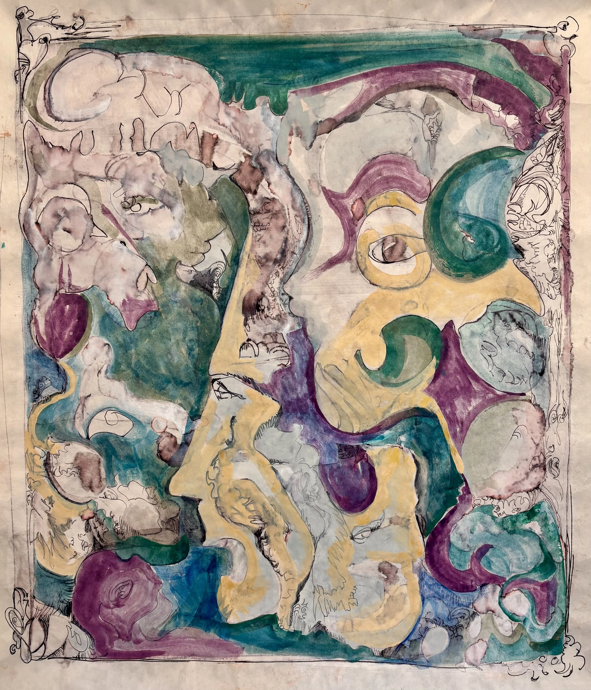 Abstract watercolor painting with swirling shapes and colors including purple, green, yellow, and blue, and some black ink outlines.