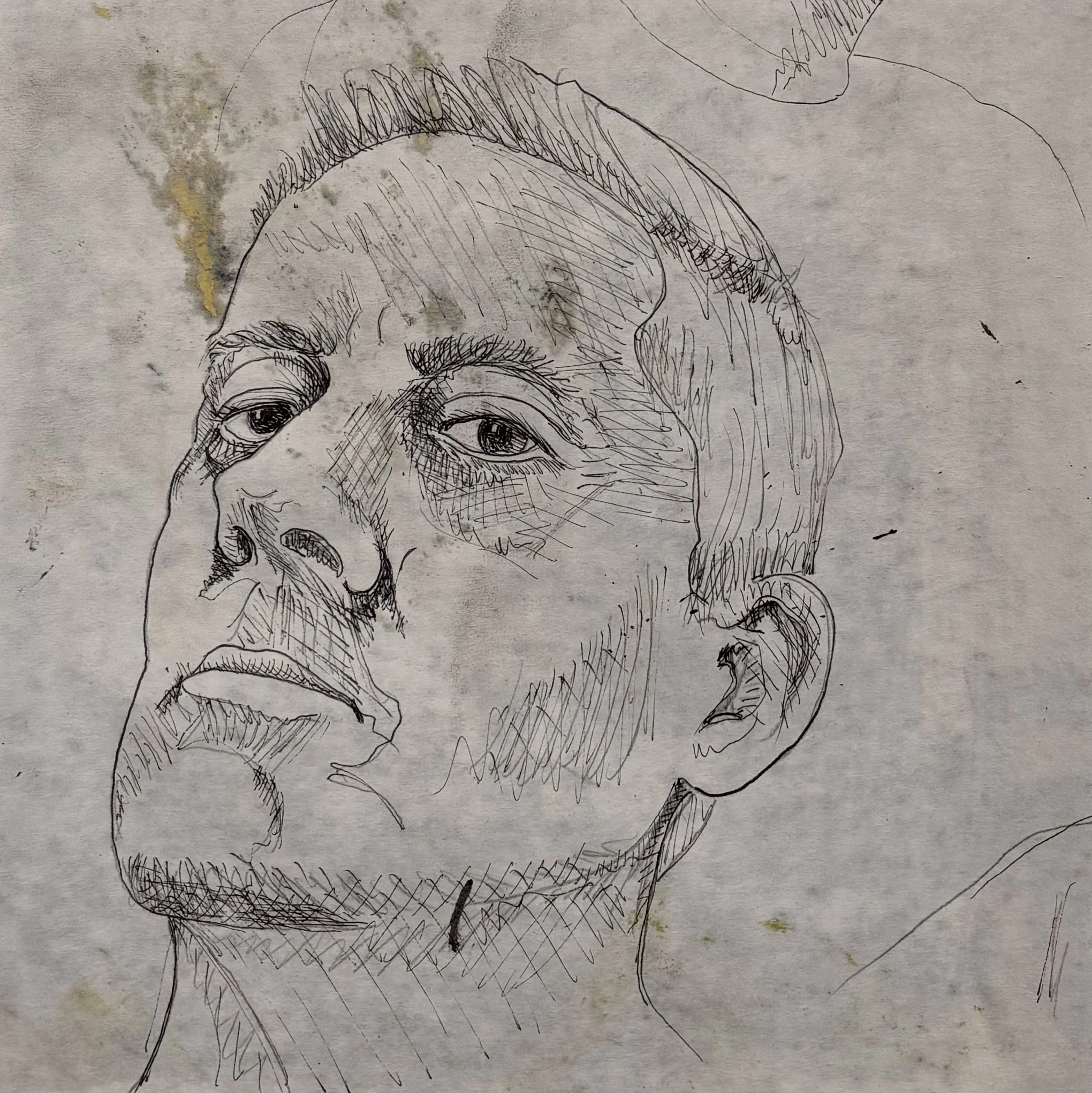 A sketch of a man's face in black ink, with detailed shading and lines, on textured paper.