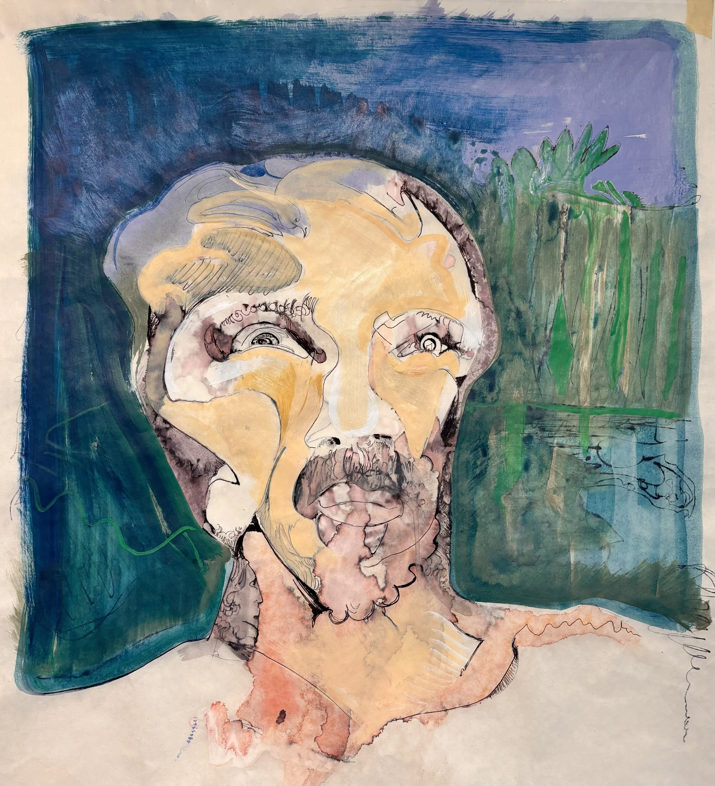 A colorful abstract portrait of a man with a beard, mustache, and expressive eyes, with a background featuring green foliage and a blue sky.